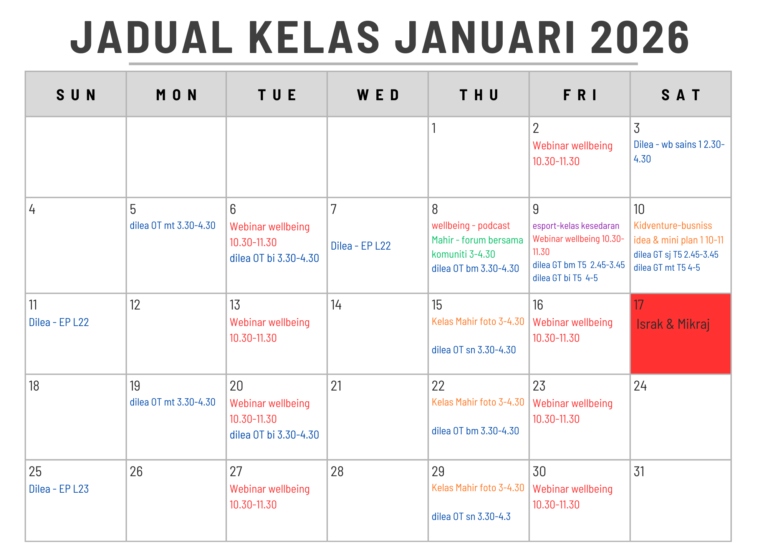 Tarikh : 06 Januari 2026 Masa : 3.30 petang – 4.30 petang Peserta : 1 orang Lokasi : NADI Pekan Bandar Baharu Tujuan Sebagai penambahbaikan daripada kelas yang pernah dijalankan. Program ini terbuka kepada pelajar Tingkatan 1 hingga Tingkatan 6 dan merangkumi subjek-subjek teras seperti […]